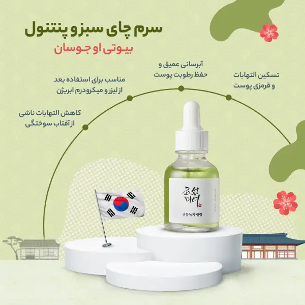 سرم چای سبز و پنتنول بیوتی اف جوسان یک انتخاب عالی برای افرادی است که به دنبال آبرسانی عمیق، کاهش التهاب و بهبود بافت پوست هستند.