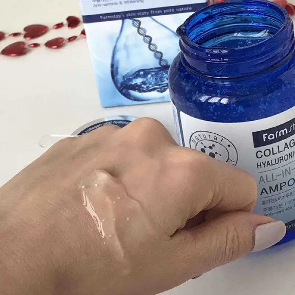 آمپول کلاژن و هیالورونیک اسید فارم استی دارای بافتی ژلمانند و سبک است که بهآسانی روی پوست پخش و جذب میشود.